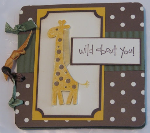 As you can see, I used the Wild About You set and some of that yummy Au Chocolat designer paper from the summer mini (makes you hungry just thinking about it!!). I made the little "mane" on my giraffe by using our grosgrain ribbon, snipping off one side of it and then shredding it. I think it makes him look so cute ...