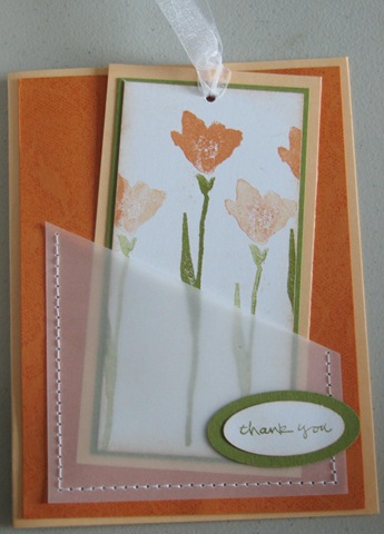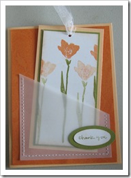I love this set - so elegant (just like me - not!). I stamped 2nd generation images of the flowers to give the softer version you can see on the "bookmark". The front actually slips in and out of the vellum pocket. This was my favourite yesterday ...