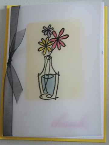 While this doesn't photograph very well because of the vellum, this was the card that got the most interest yesterday. It was the last one I put together and I wasn't really sure about it, but everyone seemed to love it yesterday. Very simple, but the vellum overlay with some images on the vellum and some on the card behind makes it a fun kind of card to give.
