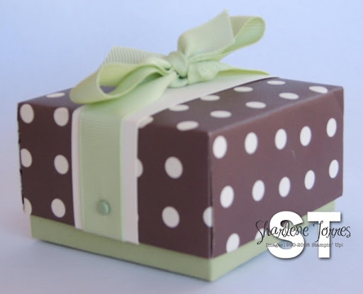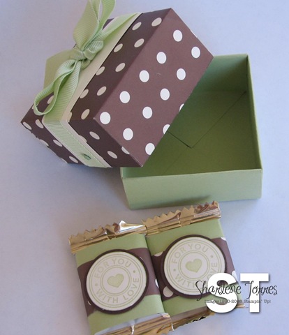 Of course you can't make boxes without putting chocolate in them, so we covered 5 chocolate mints to match the box. This would be an awesome gift (if you can keep your mitts of the chocolates long enough to give it!). I gave mine to my wonderful hostess the following night with 3 mints (I don't know what happened to the other two, honest!). Hi Leeanne!!